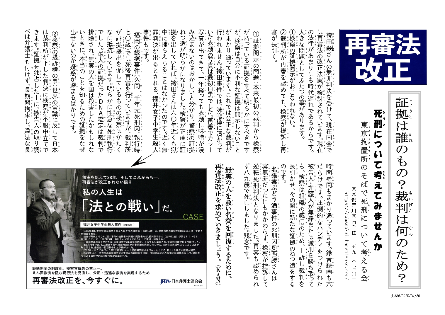 死刑囚の声をくみあげる再審法の即時改訂を!